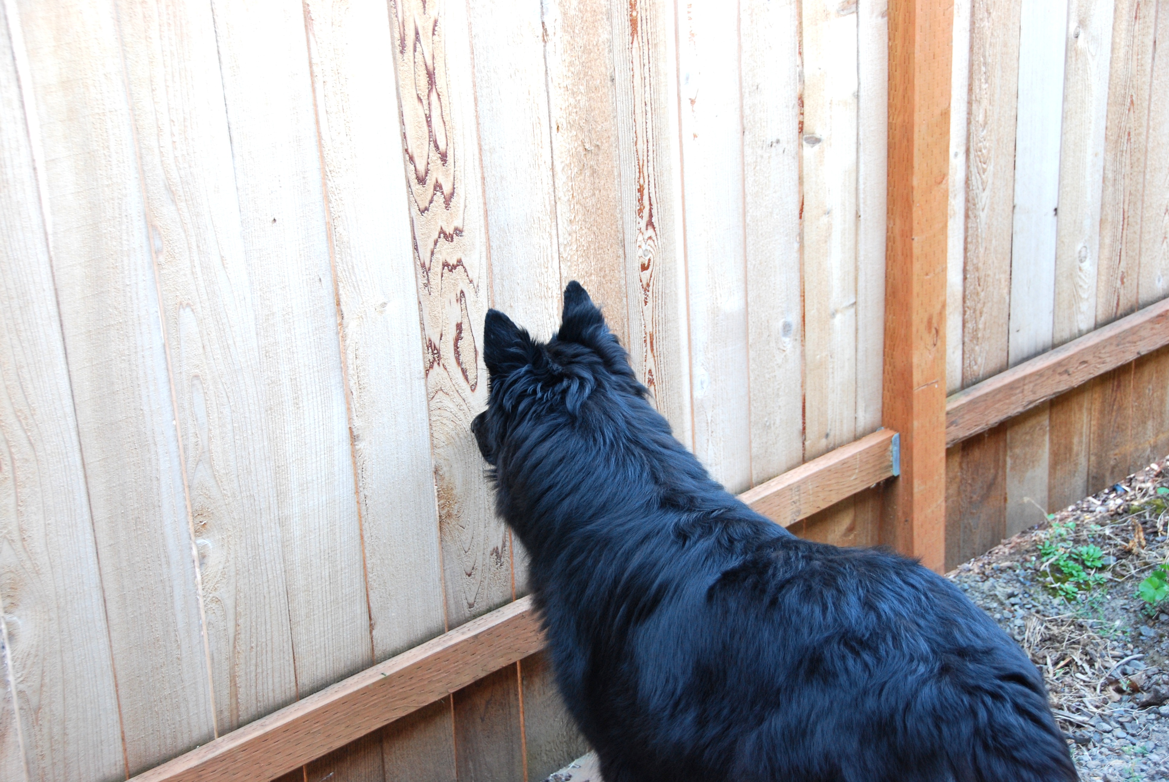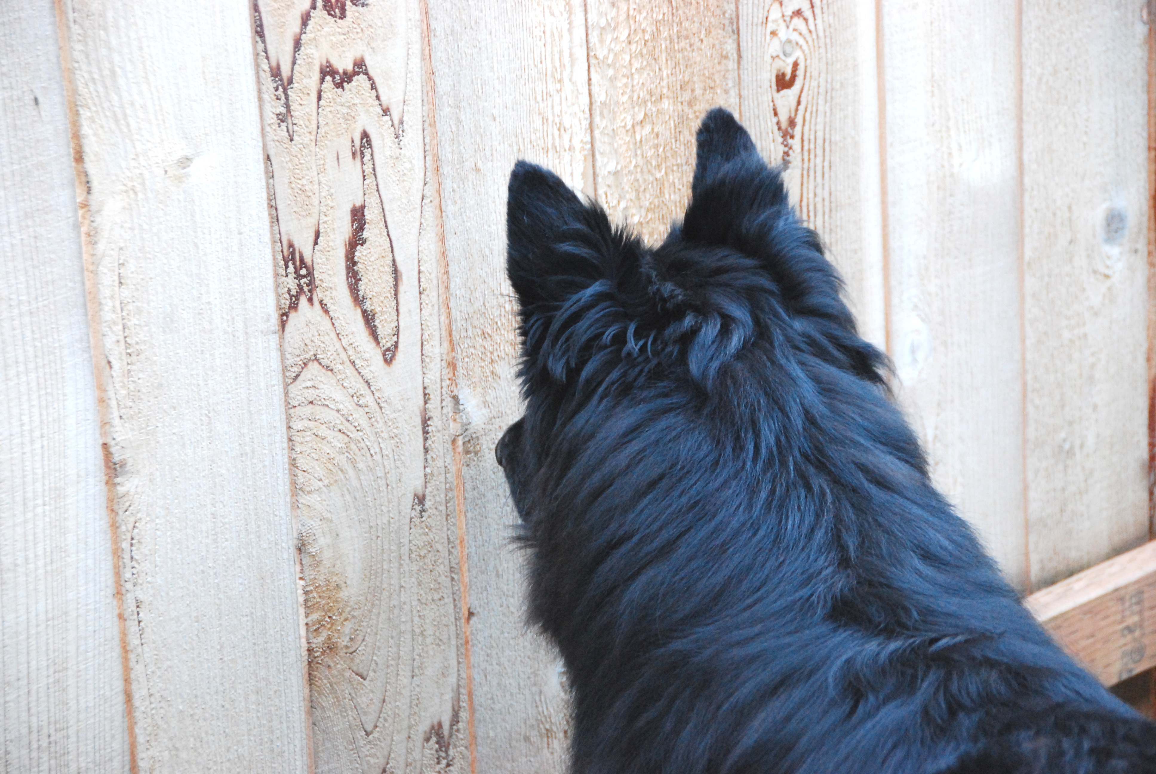 Is Bear suffering from some sort of neurosis?? tee hee! Nah! He hears his Schnauzer friend Freddy and is hoping to get a peak of him! Bear really likes Freddy!