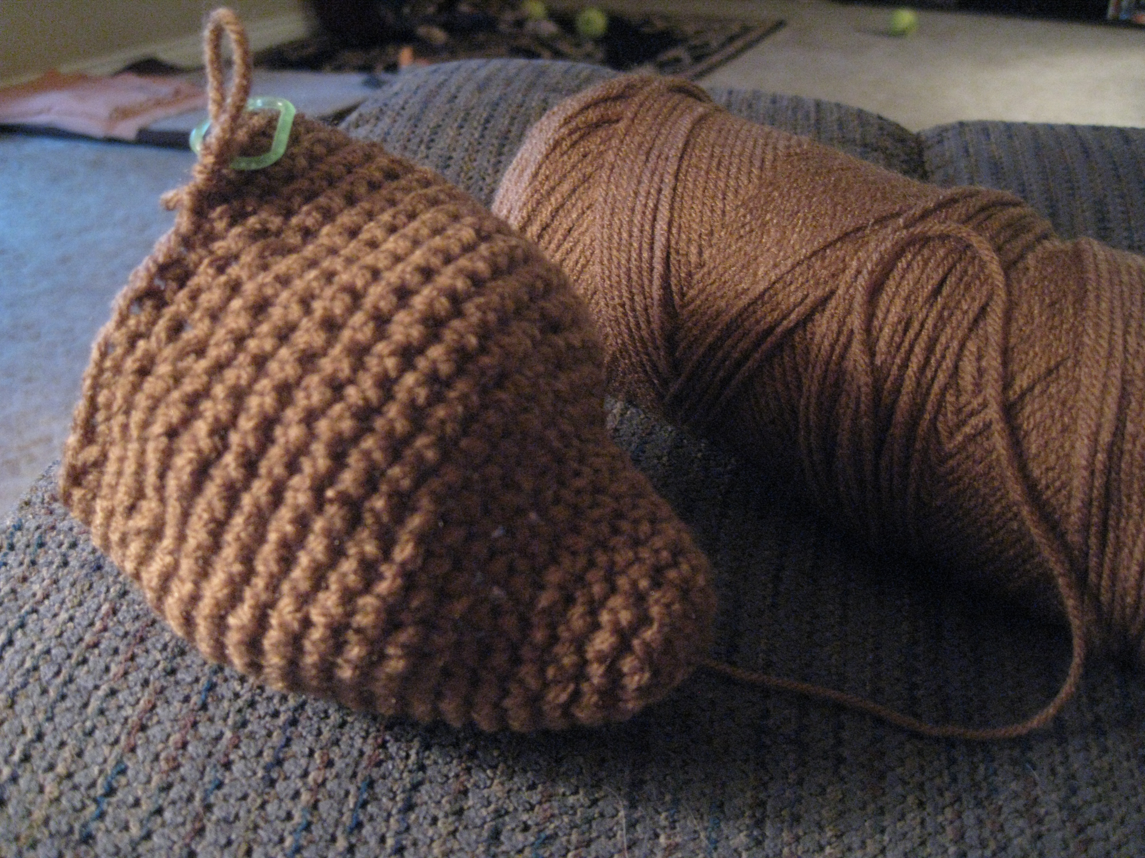 Geez Louise all I have to do is follow the pattern recipe, use stitch markers and keep track of where I am at. Every row that I do I am elated that I have not messed up so far!!! I am at a stopping point cuz I have to run to the craft store to get the items I need before I can continue on! I so can’t wait to reveal it for you! Here is the pic of my progress so far!