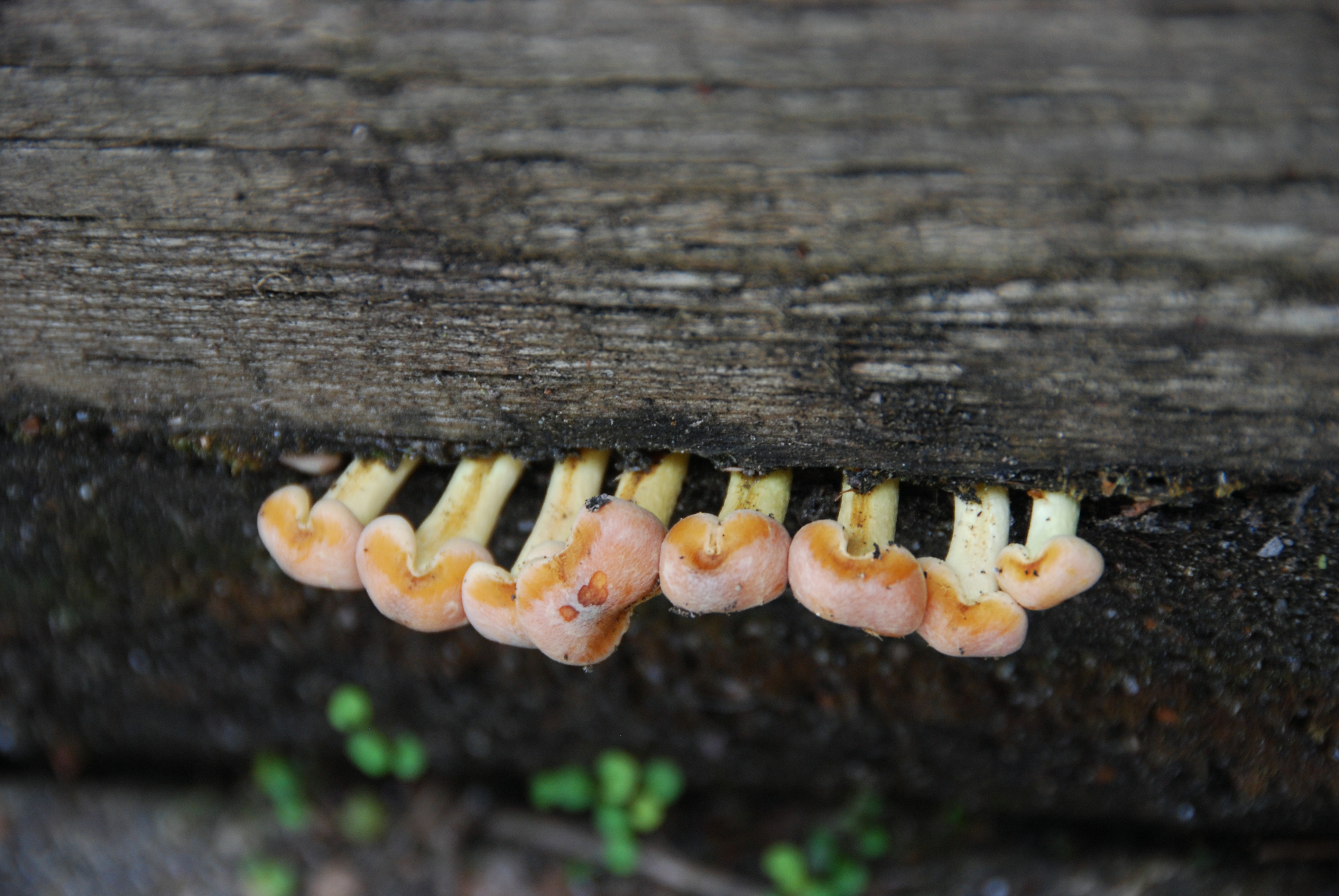 These tiny mushrooms are growing out of the side of one of our flower beds.