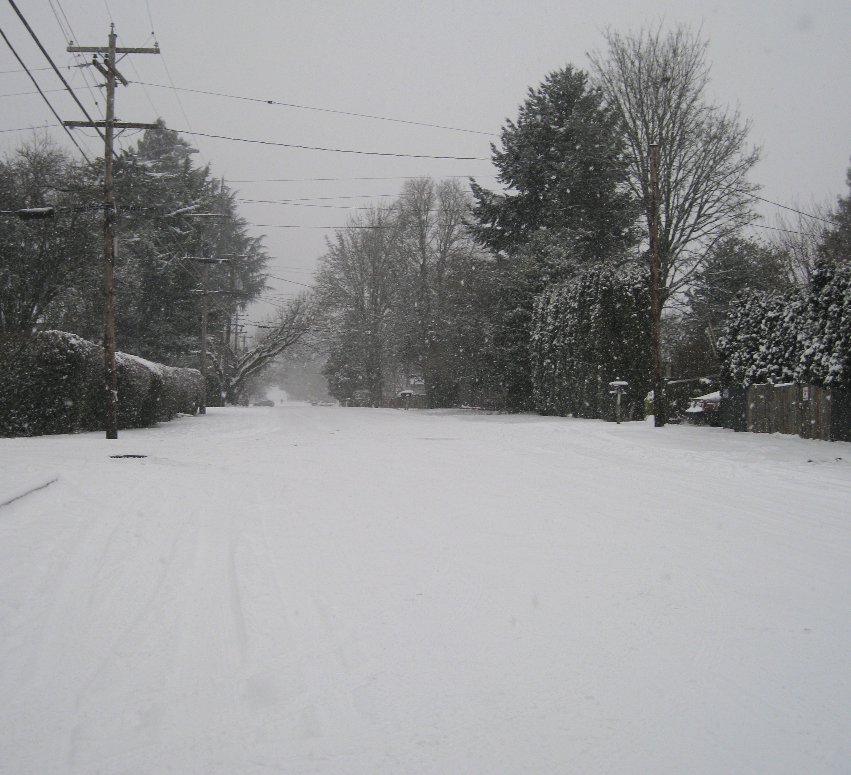 A snow covered, quiet street.