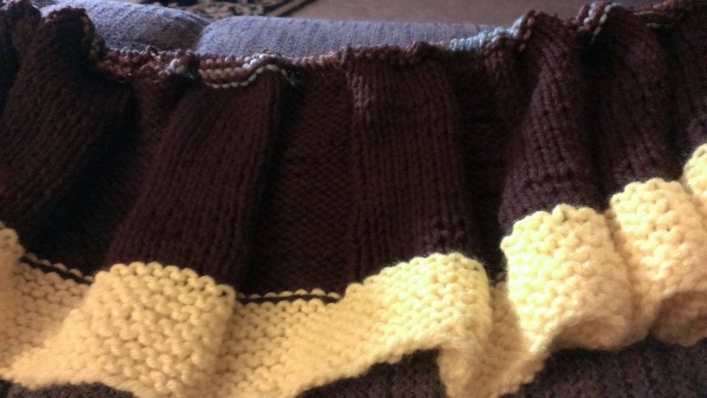 My knit blanket is getting bigger! I’m using variegated color for my next section and it is looking good!