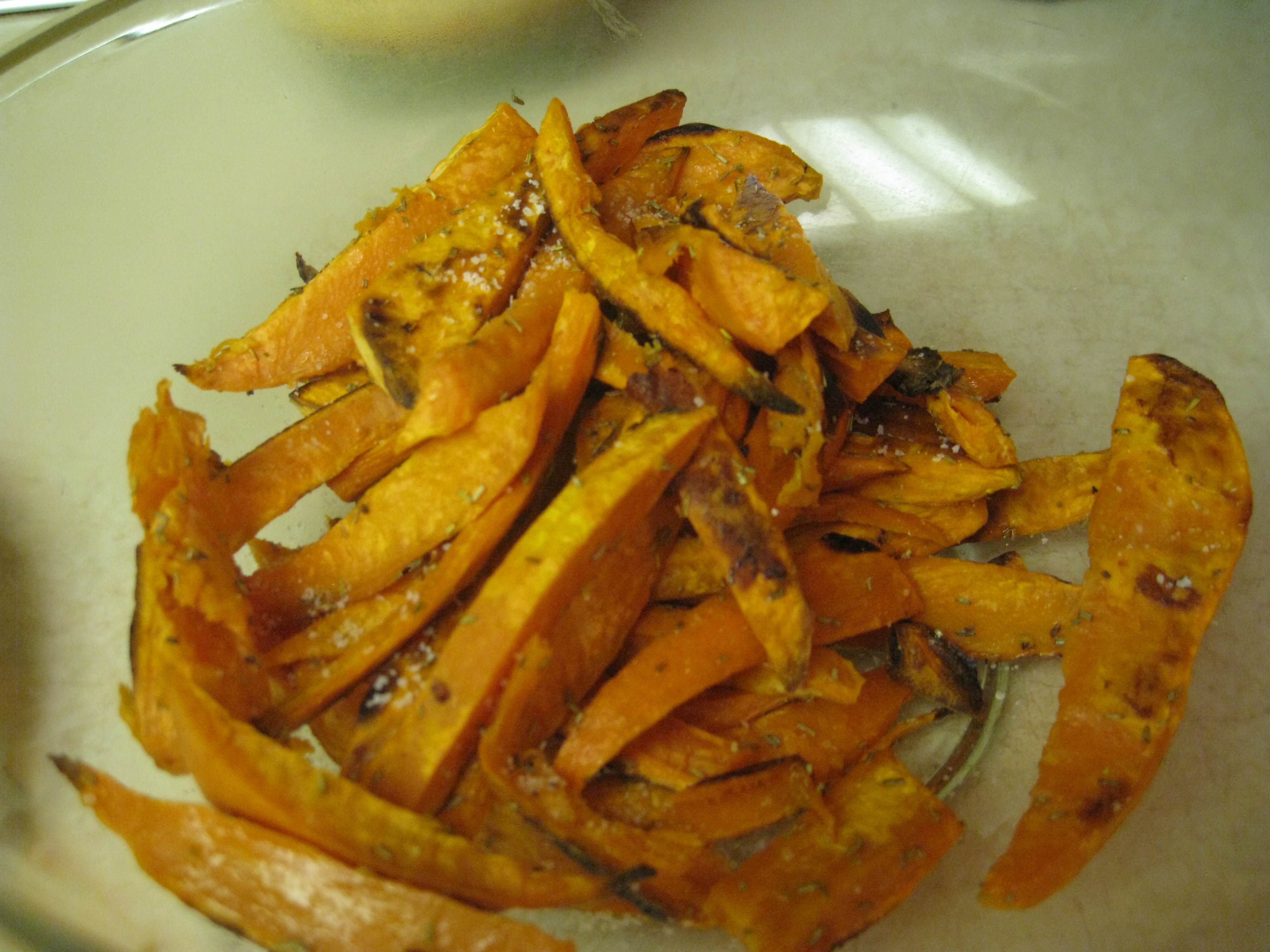 Take two yams, remove skins, coat in a tablespoon of olive oil, sprinkle with rosemary and kosher salt, bake in 425 deg oven for 30 minutes! I did 4 yams and baked in two batches!