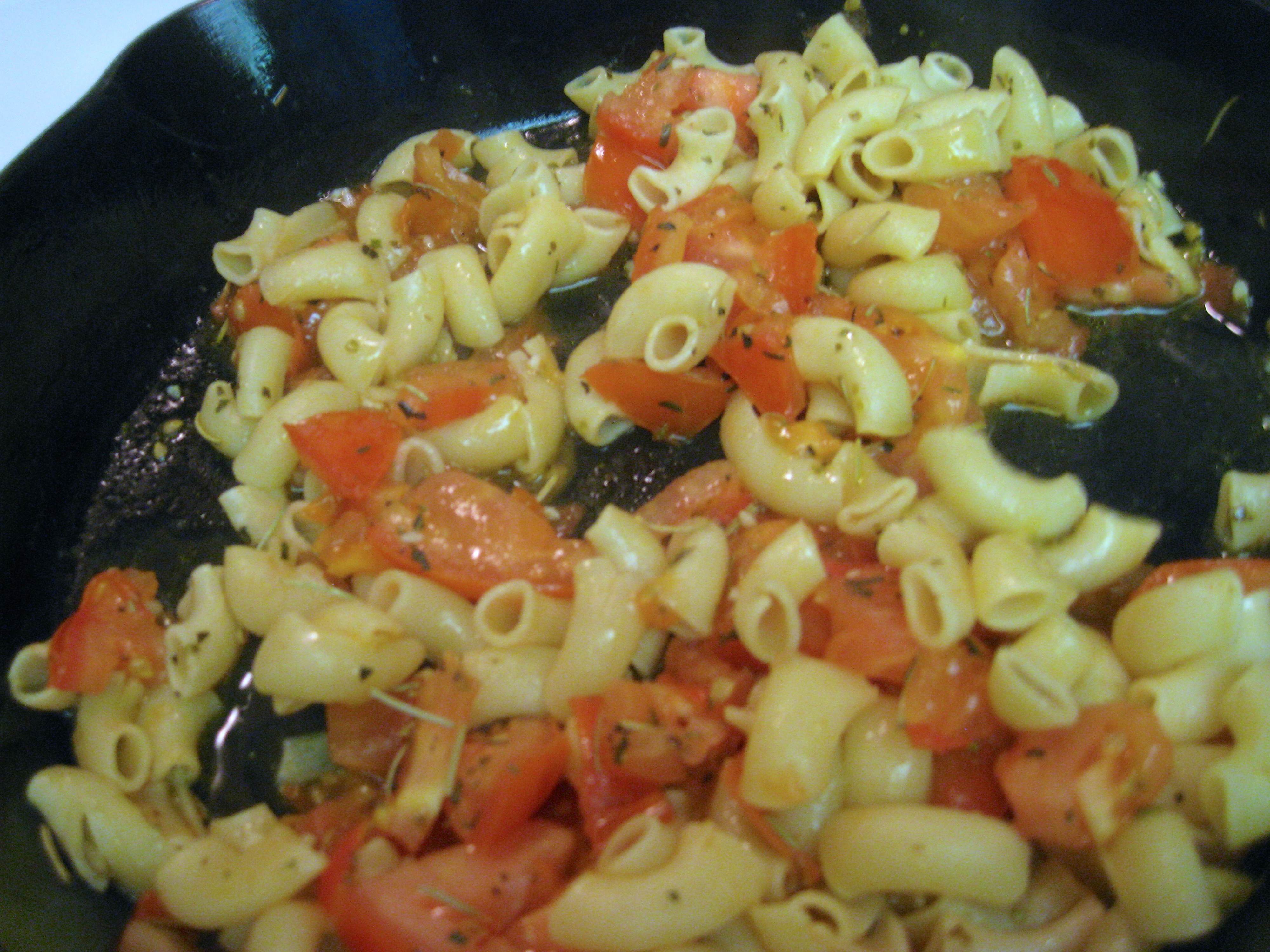 I had some extra cooked pasta in the freezer so I thawed it, place some olive oil in the fry pan, I have a jar of minced garlic so I put some of it in the olive oil, got it going with the heat on, added diced fresh tomatoes, add your favorite spices, I added Italian Seasoning, Basil, Salt, Pepper
