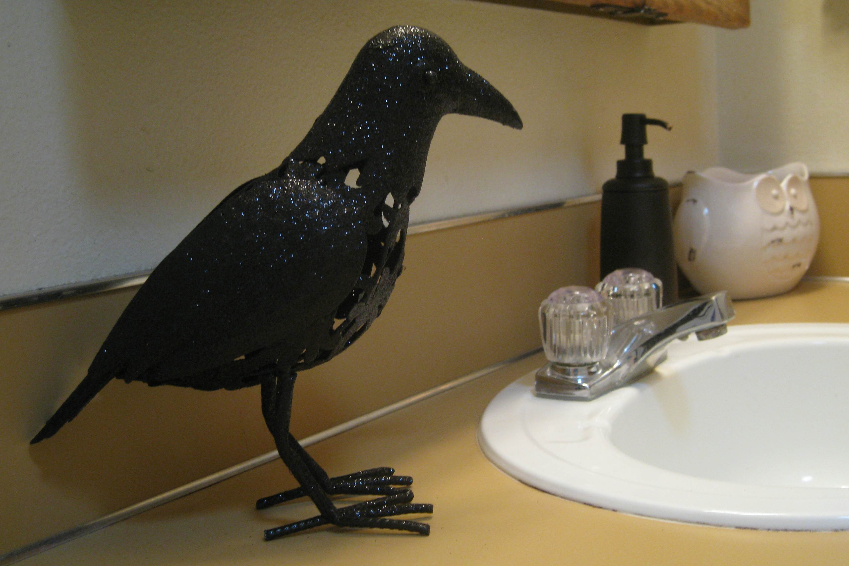 My spare bathroom decor! I love owls so the owl bowl is a cute addition, today I got the crow in the Halloween section of the store. I love crows! He makes a wonderful addition in my bathroom!