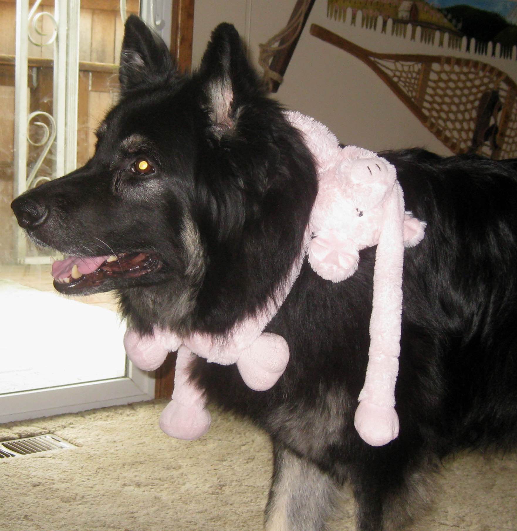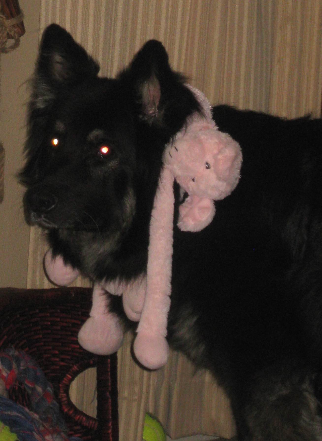 TodaysDinnerEarly this morning I put a brisket in the crock pot, when it was done I used all of the juices to make home made gravy and this was our lunch today! It was so good!MondoOnHisBack1MondoOnHisBack2“Get this Mondo off my back”!!!!!! Poooooor puppy!!!!! tee hee! This is one of Bear’s favorite toys! HatProjectHere is my latest hat project, It ended up being too big of a pattern though! I still like it however!!!! I have to crochet the band that goes on it!