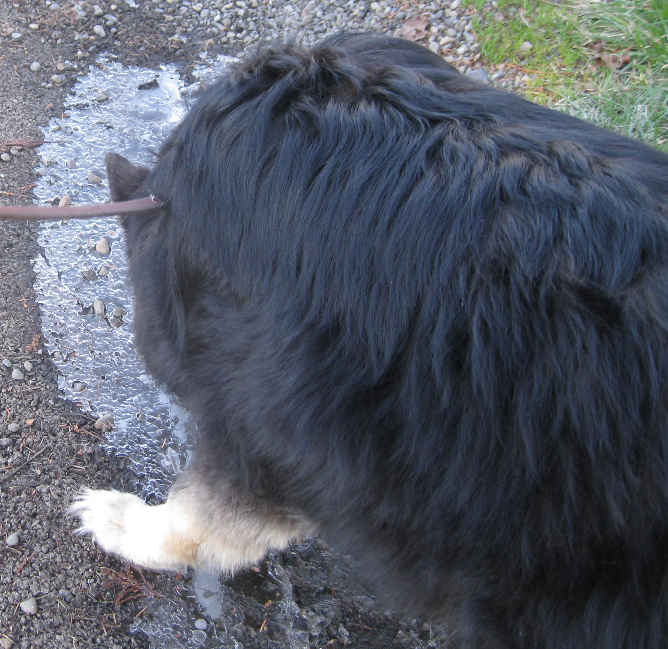 The sun was shining bright today, but weather was a mite bit chilly! Bear was having fun licking ice on our walk this afternoon.