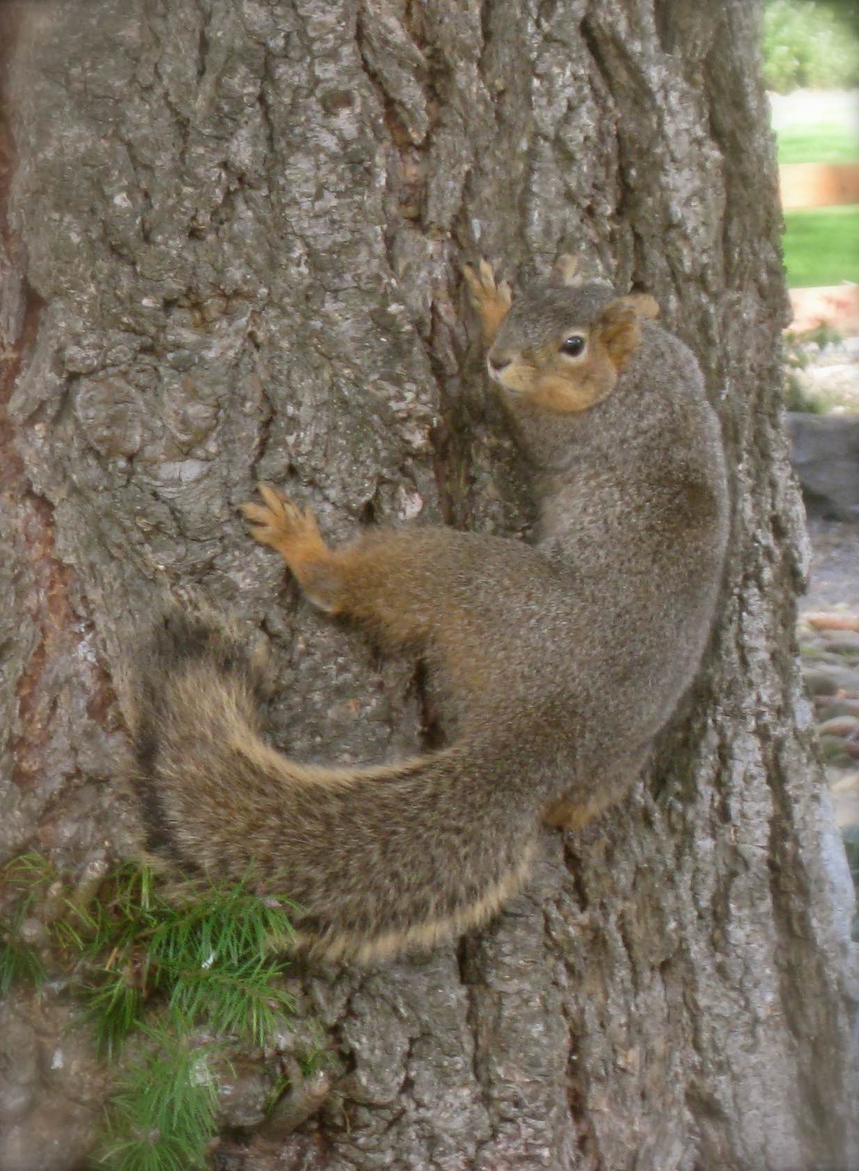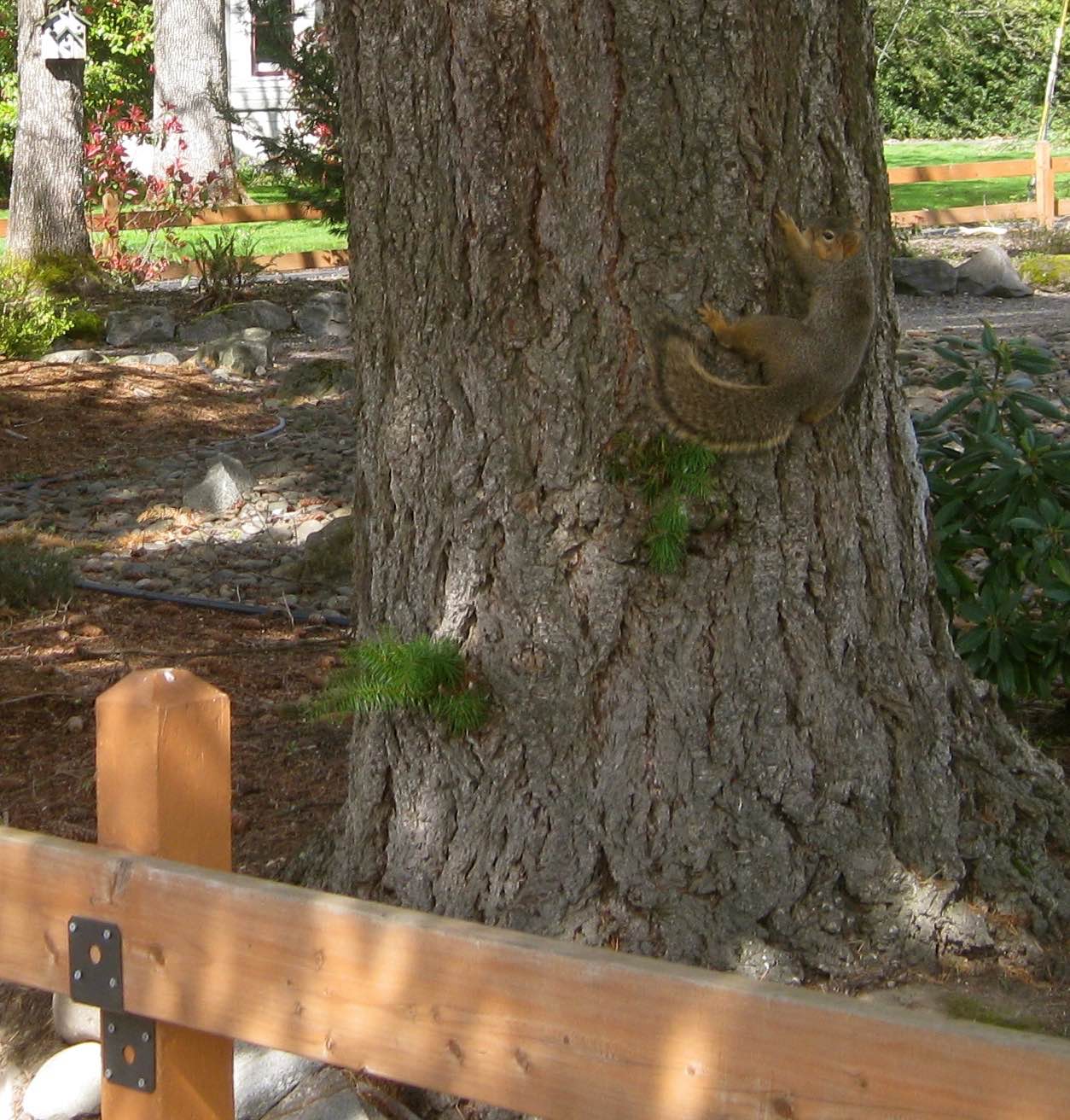 This cute squirrel is hanging out or hugging the tree! He was nice and posed for me to take his photo!