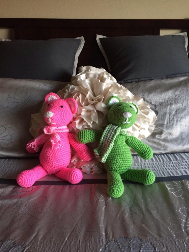 Laurie’s Bears are snuggled on her bed! Very awesome that she loves them so much!!