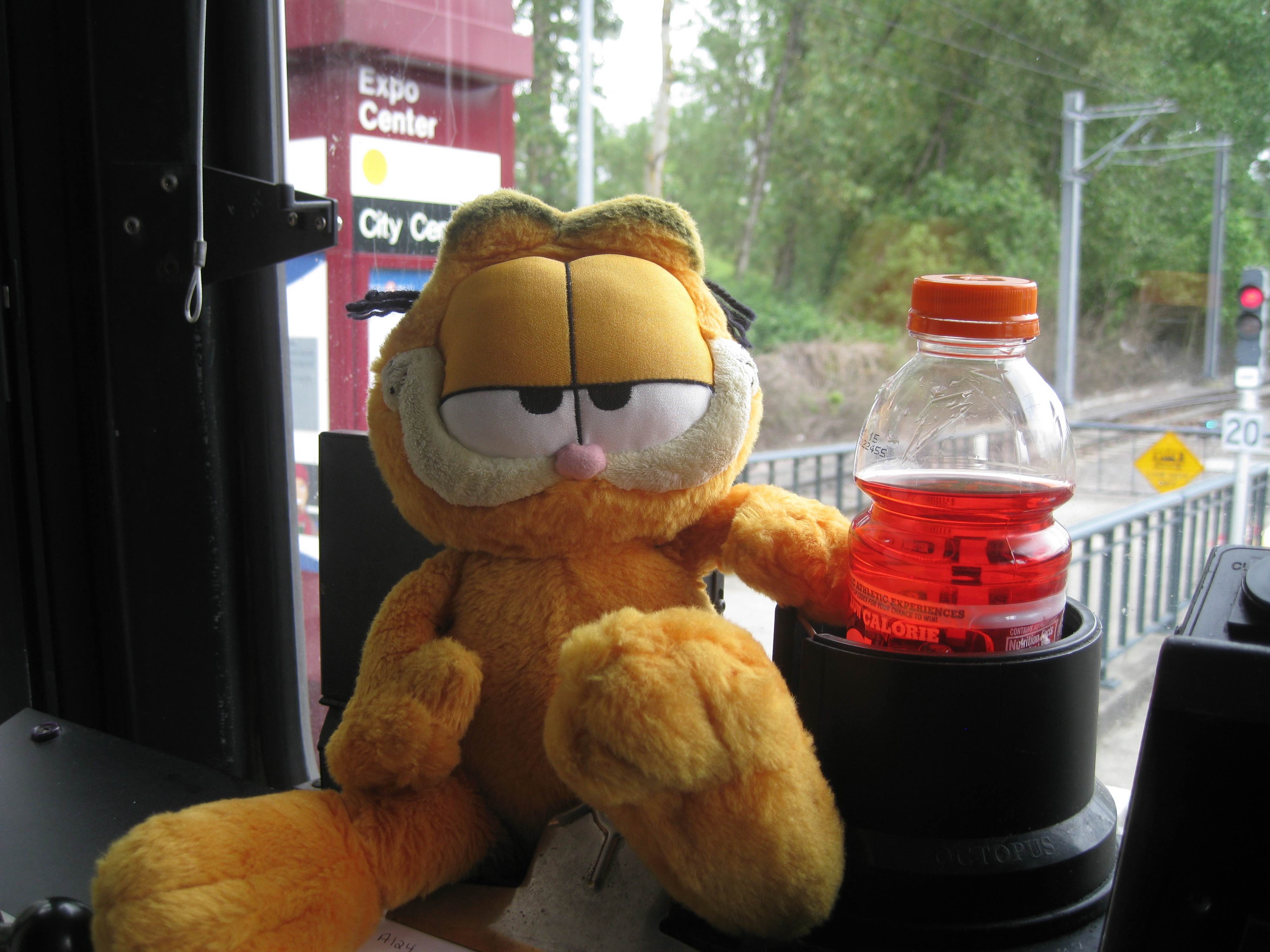 Garfield is always a big hit as my train pet! Here he is enjoying some of my gatorade on our break! tee hee! He would rather have Lasagna though!