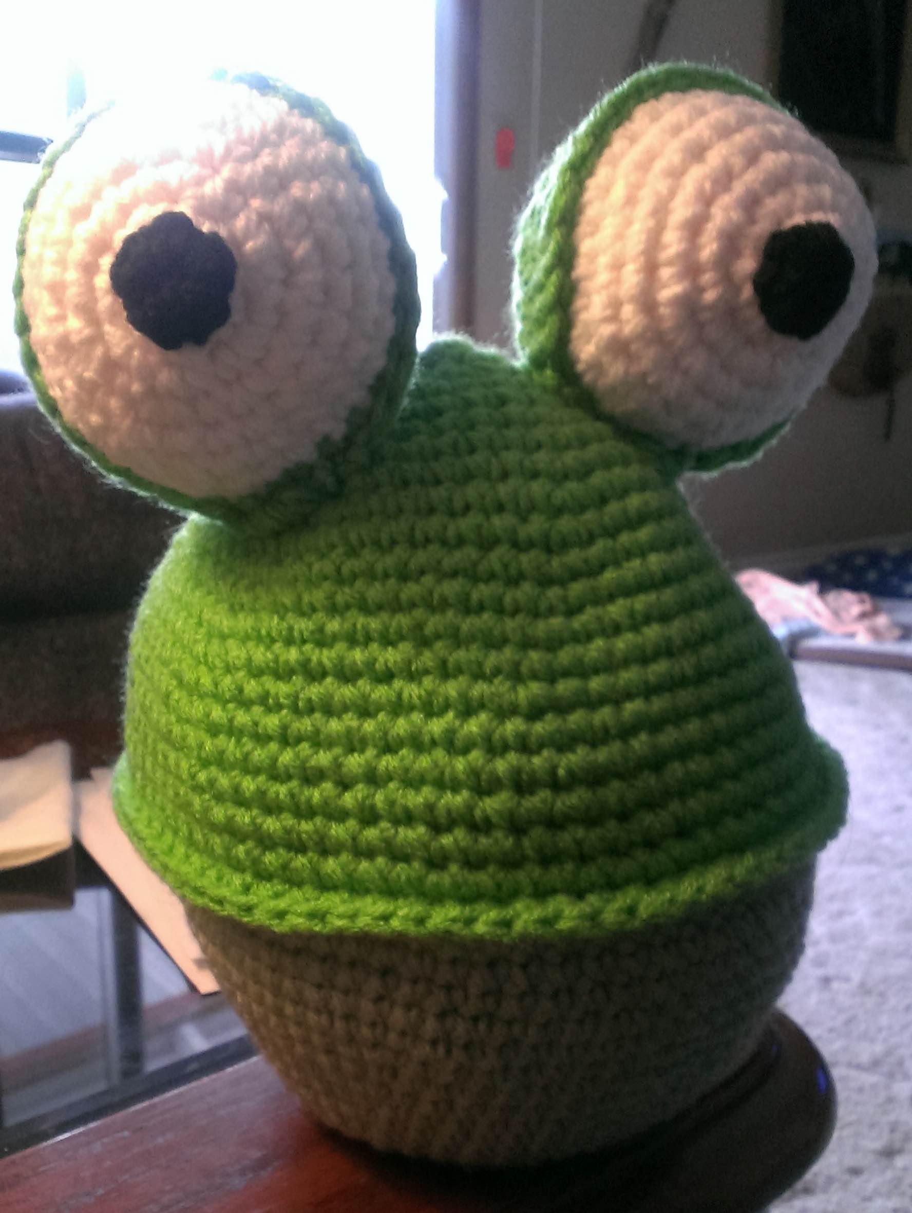 I am working on a Mondo Frog! He is so cute! I am working on his legs and arms now and then he will be done! I love crocheting stuffed animals!