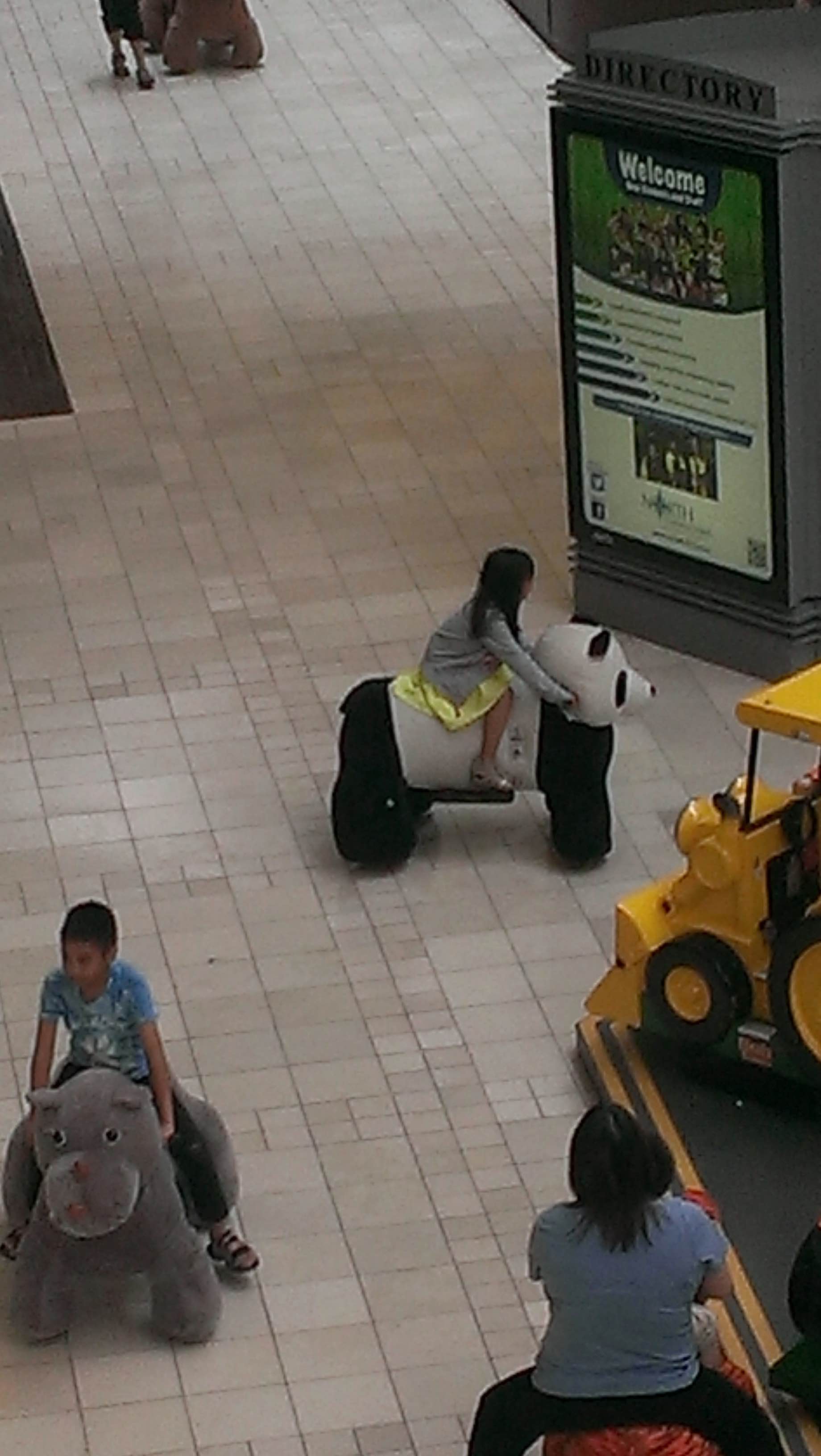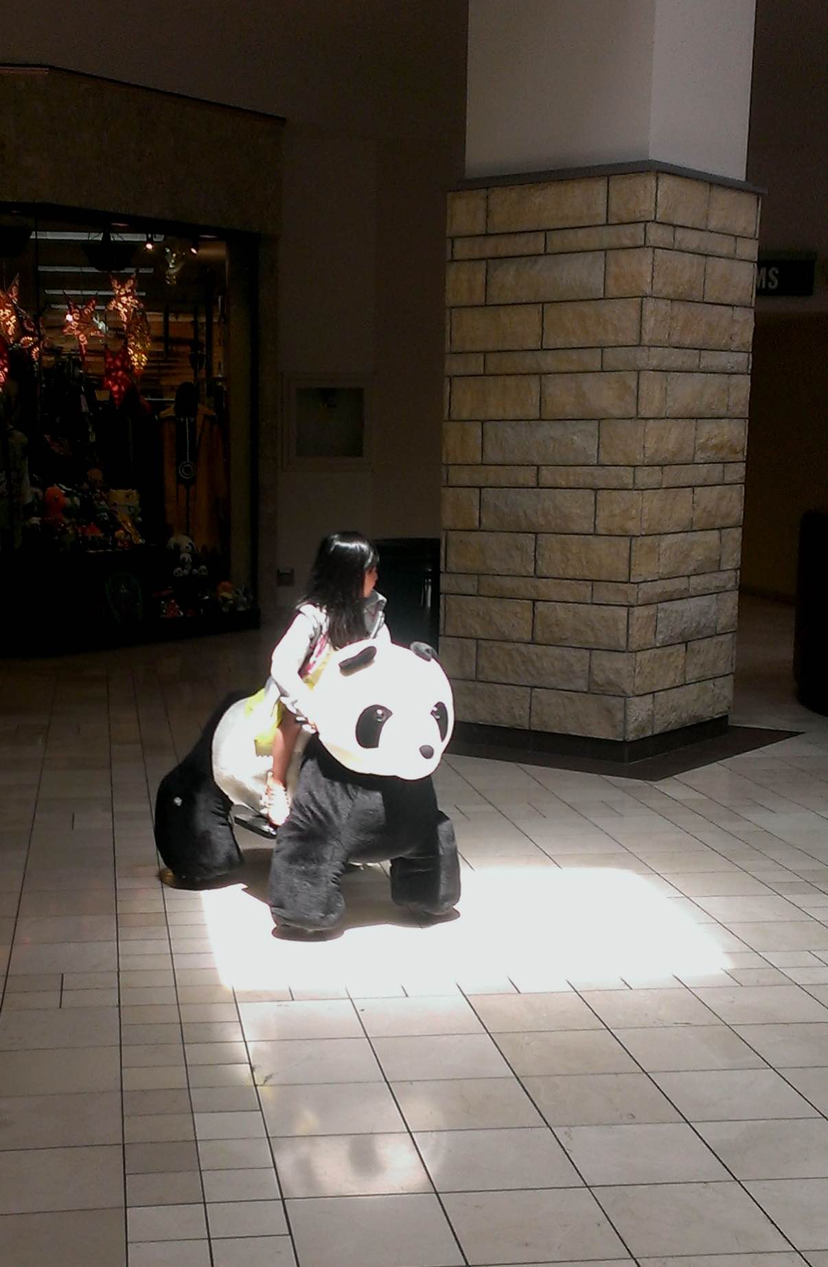 This cute little girl is riding a panda in the mall! I love how in my photo you can see the reflection of the panda’s head in the floor!