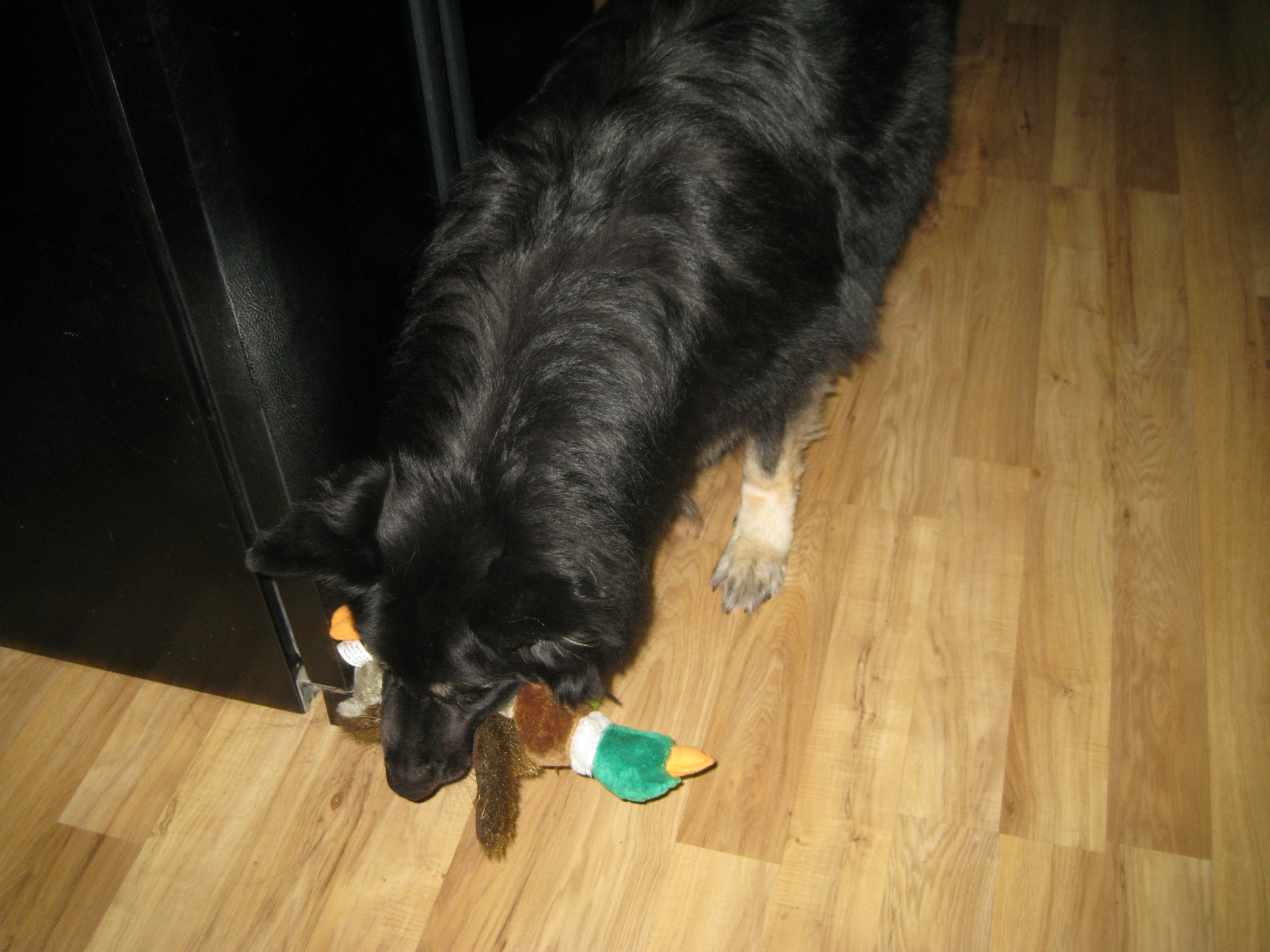 Here is Bear waiting for me to kick his ball down the hallway, he squeaks his duck as he bats the ball back to me with his paw. We call it him playing soccer! Bear has his rules to of how the game is played! It’s hilarious!